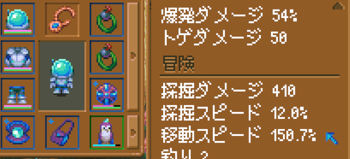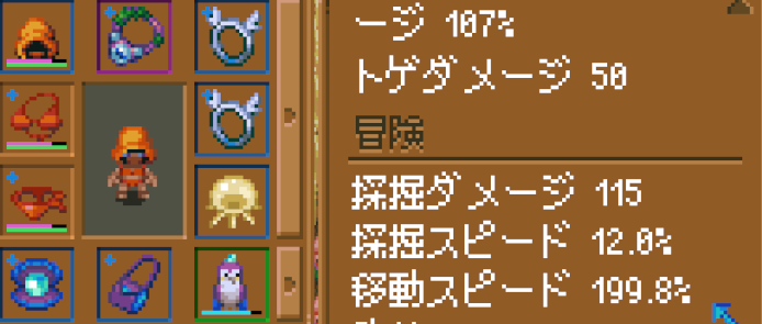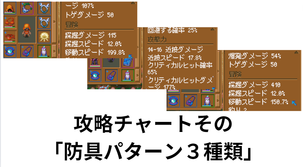 • 穴掘り装備:採掘ダメージを上げまくって壁を突き進む装備