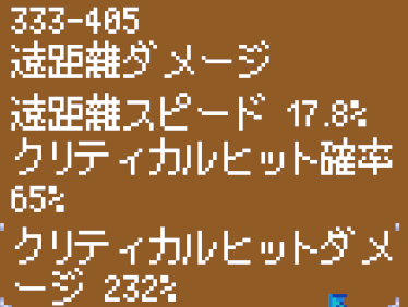 DPSは攻撃速度が秒間2.5なので、最大値を言えば、405x2.5x2.32x0.65で1526という数字が出ましたね。ちなみにソラライトのクロスボウのDPS1229でした。単発火力は高いので敵を一撃で仕留めたいときはクロスボウがいいですね。DPSと単発ダメージは用途が違うので一概に強い弱いでは測れません。