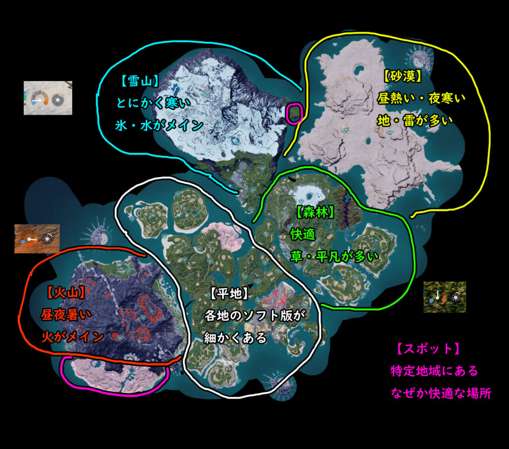 パルワールドでは大きくわけて4つの地域があります。