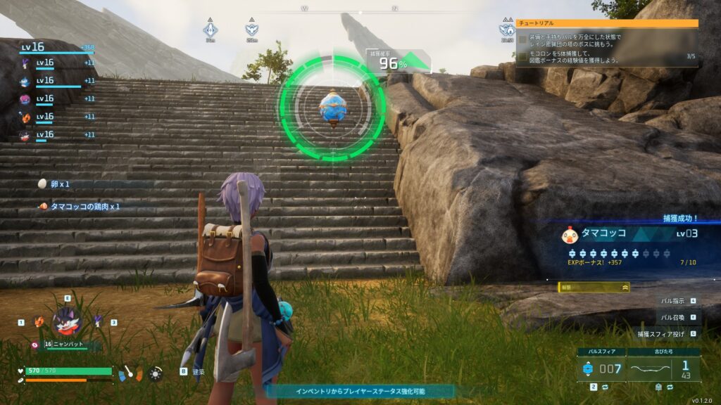 始まりの台地はとにかくパルの生息数が多いので乱獲レベリングに最適です。ちなみに1体あたりの経験値はボーナスにも差がありますがかなりの経験値が入るので、タマコッコでさえ目玉焼きやベリーを150個焼くのと同じ経験値がものの数秒で入ります。これを10体までやれるのでソロでやるならお勧め。
