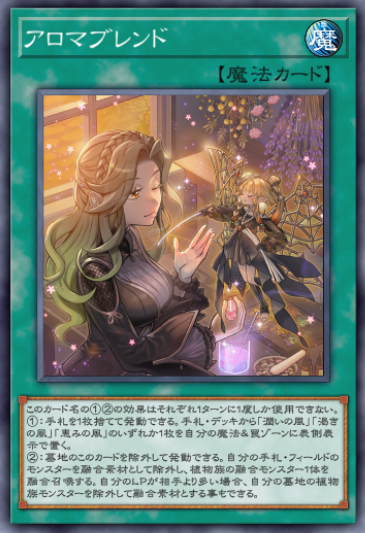 アロマブレンドは融合系列のカードですが、同時にアロマ風をサーチしてそのまま場に表側で置くことができます。アロマブレンドを使えば、そのターン中に罠の効果を発動できるためサーチや墓地復帰などの効果がすぐに使用できます。もちろんリリスマリーのサーチ対象でもあります。